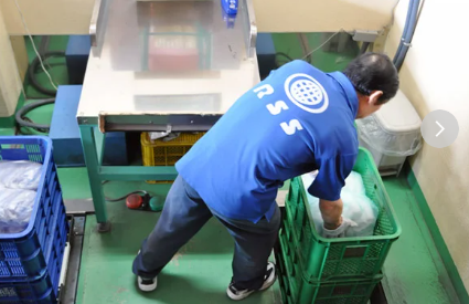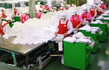 ほぐされたおしぼりは巻き場(おしぼりを包装する場所)に運ばれて行きます。