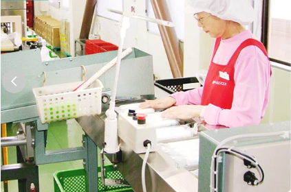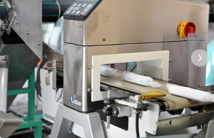 丁寧に包装したおしぼりは金属探知機に運ばれます。