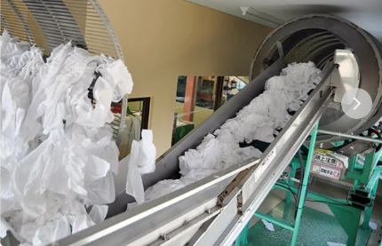 おしぼりのケーキ(脱水されたおしぼりの塊)はシェーカーという機械でリント(糸くず)を落としながらほぐしていきます。